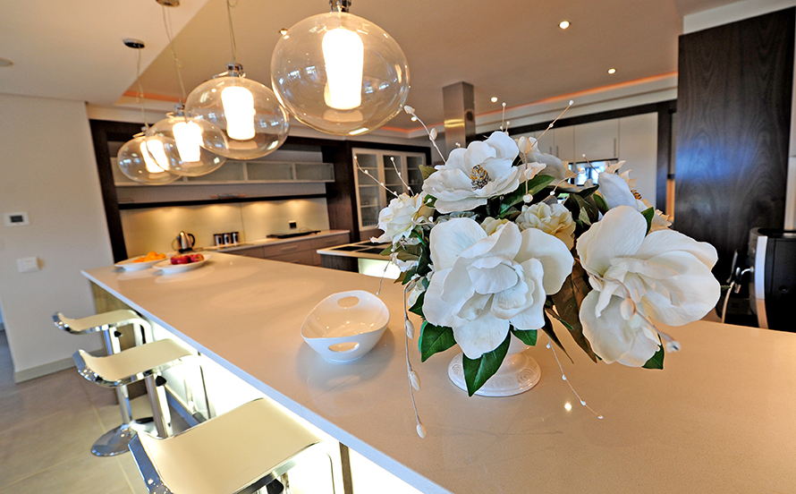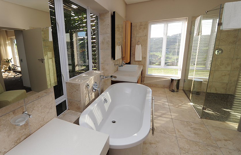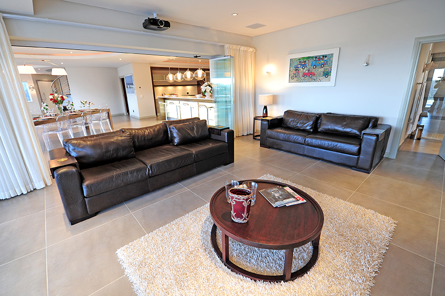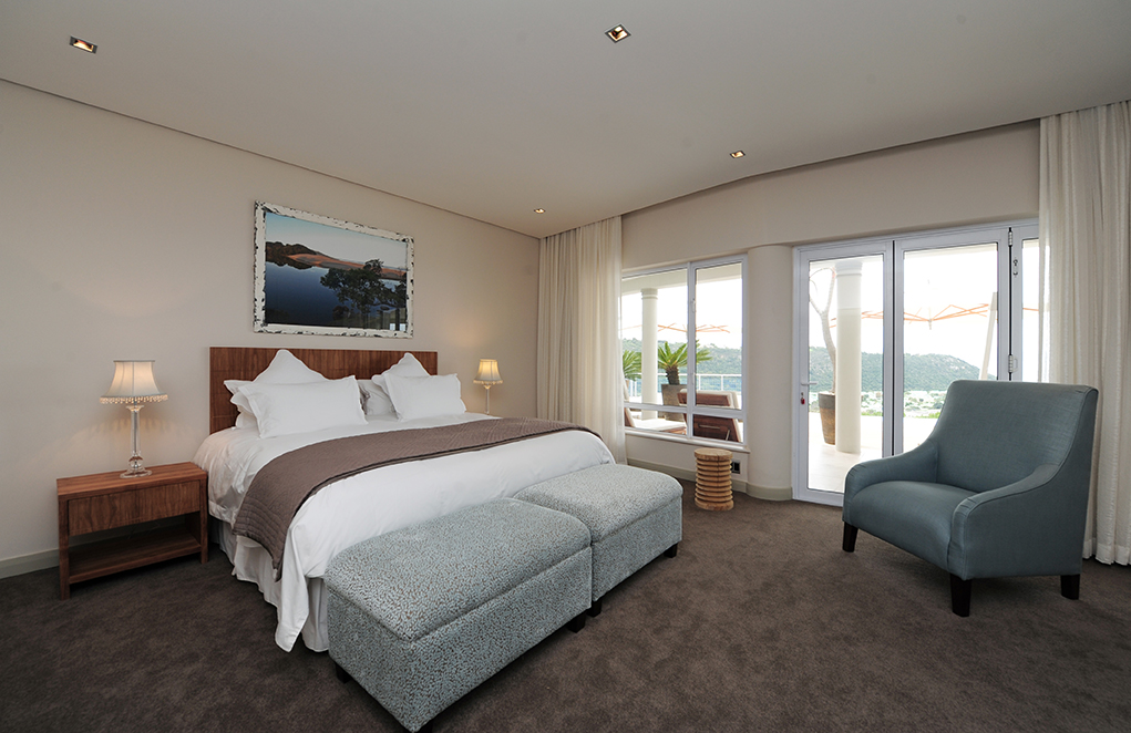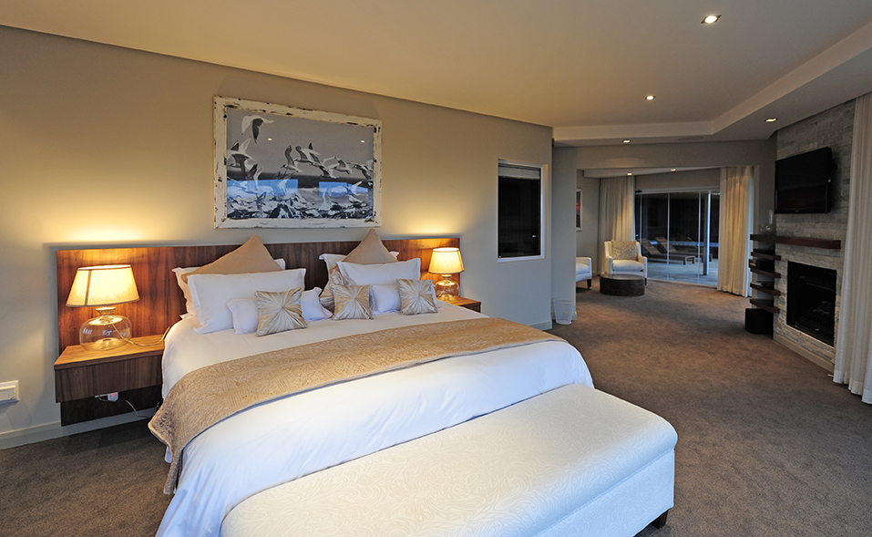 The villa sleeps 12 guests in 5 spacious bedrooms, all elegantly furnished and with en-suite bathrooms. Four of the five suites open onto the pool deck, upper deck or patio, affording breath-taking views of the surrounds. King-size extra length beds, which can be divided into single beds, have the finest quality bed linen. The ample cupboard space, block-out curtaining, state of the art music systems ensure a luxurious and comfortable stay. En-suite bathrooms are fitted with under-floor heating, heated towel rails, bath, shower and dual washbasins. The master bedroom includes a dressing room, private sitting area with gas fireplace, as well as sumptuous spa bath and shower with protected views of the valley and ocean. The fifth bedroom has two bunk beds and a sleeper couch.