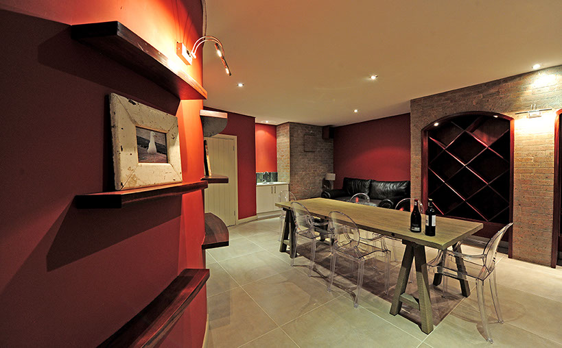 The fully-equipped kitchen features a breakfast bar, central island and large prep areas, and is furnished with the latest appliances; including gas hob, double oven, walk-in cold-room, fridge/freezer, ice-maker, wine fridge, convection microwave, coffee machine, kettle and other appliances to suit every need. A separate scullery and laundry contain a dishwasher, washing machine and dryer. The dining and sitting room area are bright and spacious, and flow seamlessly onto the pool deck by means of the large glass fold-out doors. The dining area is fully equipped and boasts a custom-made 8-seater hard wood table. Adjoining the sitting room area is a wine cellar with dining area, walk-in fridge/freezer and wine cooler.