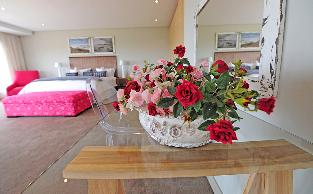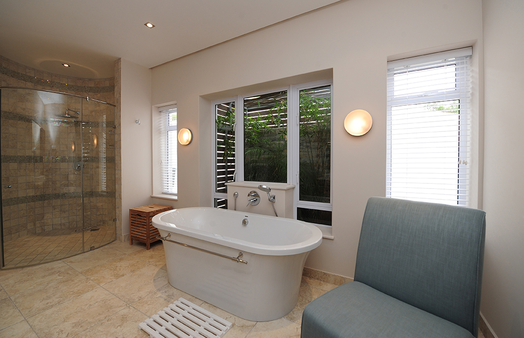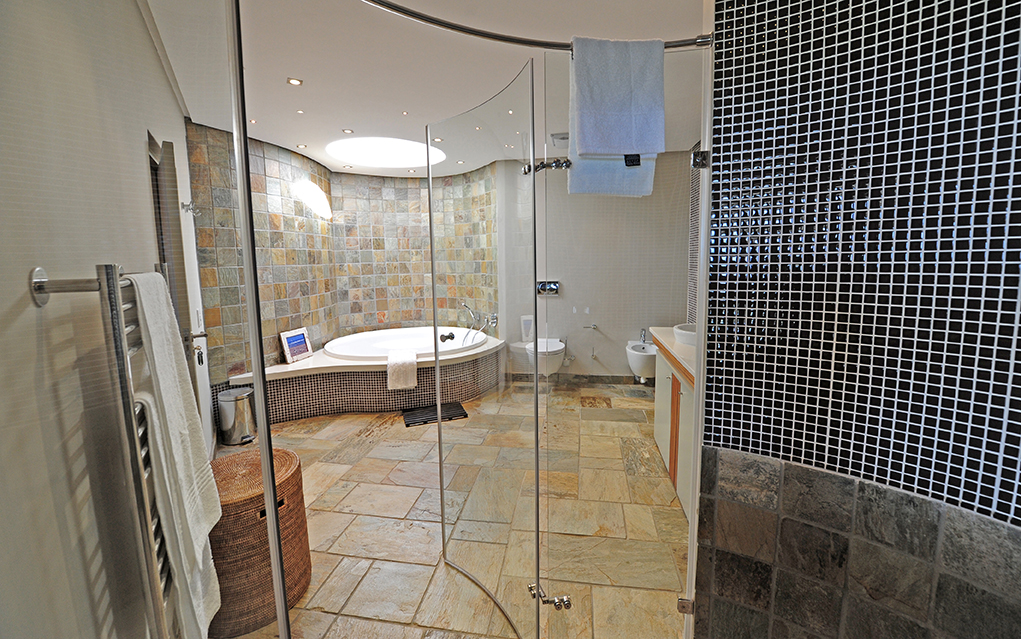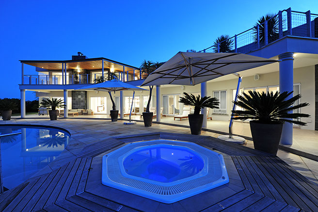 The villa sleeps 12 guests in 5 spacious bedrooms, all elegantly furnished and with en-suite bathrooms. Four of the five suites open onto the pool deck, upper deck or patio, affording breath-taking views of the surrounds. King-size extra length beds, which can be divided into single beds, have the finest quality bed linen. The ample cupboard space, block-out curtaining, state of the art music systems ensure a luxurious and comfortable stay. En-suite bathrooms are fitted with under-floor heating, heated towel rails, bath, shower and dual washbasins. The master bedroom includes a dressing room, private sitting area with gas fireplace, as well as sumptuous spa bath and shower with protected views of the valley and ocean. The fifth bedroom has two bunk beds and a sleeper couch.