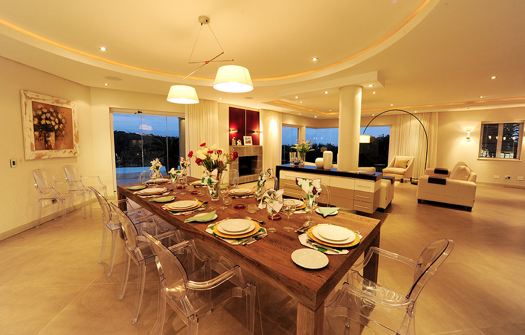 The fully-equipped kitchen features a breakfast bar, central island and large prep areas, and is furnished with the latest appliances; including gas hob, double oven, walk-in cold-room, fridge/freezer, ice-maker, wine fridge, convection microwave, coffee machine, kettle and other appliances to suit every need. A separate scullery and laundry contain a dishwasher, washing machine and dryer. The dining and sitting room area are bright and spacious, and flow seamlessly onto the pool deck by means of the large glass fold-out doors. The dining area is fully equipped and boasts a custom-made 8-seater hard wood table. Adjoining the sitting room area is a wine cellar with dining area, walk-in fridge/freezer and wine cooler.